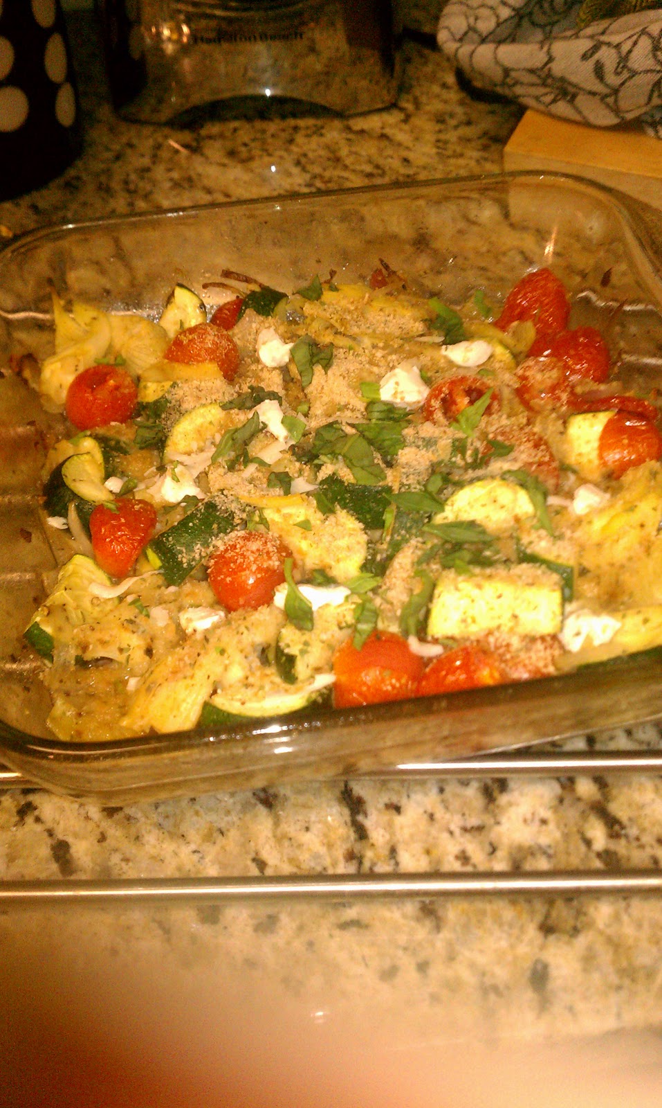 I am thrilled that I created this. D wanted baked tomatoes because he loves them. I did not want to buy two types of tomatoes (I was buying cherry tomatoes for a dish later in the week) so I decided to bake tomatoes but inside a casserole dish. The result of my creation was a man friend who did not say a word throughout dinner, licked his plate, and got seconds. These actions were all precursors to a rave review. This is a super easy, super fresh, super healthy, super delicious, super versatile, and perfect for summer or winter (adjust veggies accordingly).Final verdict: Keeper!