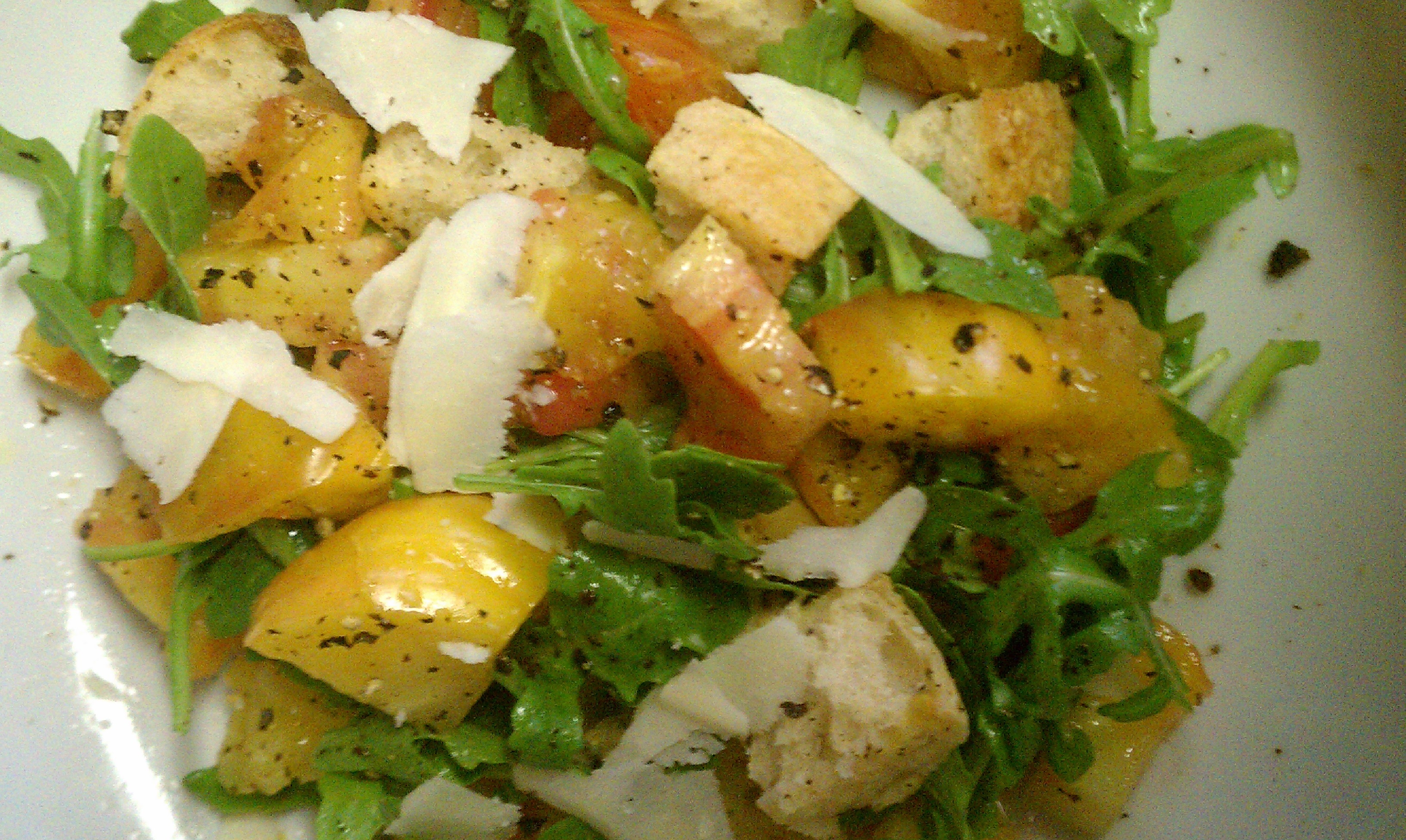 On a baking sheet, combine olive oil and bread and toss to coat. Toast in an oven for about 5 minutes, then toss and continue toasting until the outside is crunchy and the inside remains soft. Whilst the bread is toasting, combine the arugula salad and tomatoes in a large bowl. Gently toss with Salt and Pepper to taste and drizzle just a touch of good olive oil and toss once more. Once bread is toasted, combine into salad mixture and add additional cheese tossing, gently, one more time. Enjoy the simple pleasure of summer tomatoes and forget about the ridiculous heat for a few minutes!
