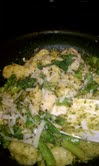 In a large skillet, combine cream, pesto, asparagus, and fresh pepper (if you have minced garlic or shallot you need to use throw it in but it is not necessary) and bring to a simmer for about 5 minutes. Gently toss the gnocchi with the sauce, coating well. Remove from heart. Garnish with Cheese, basil, and pepper to taste and serve immediately.