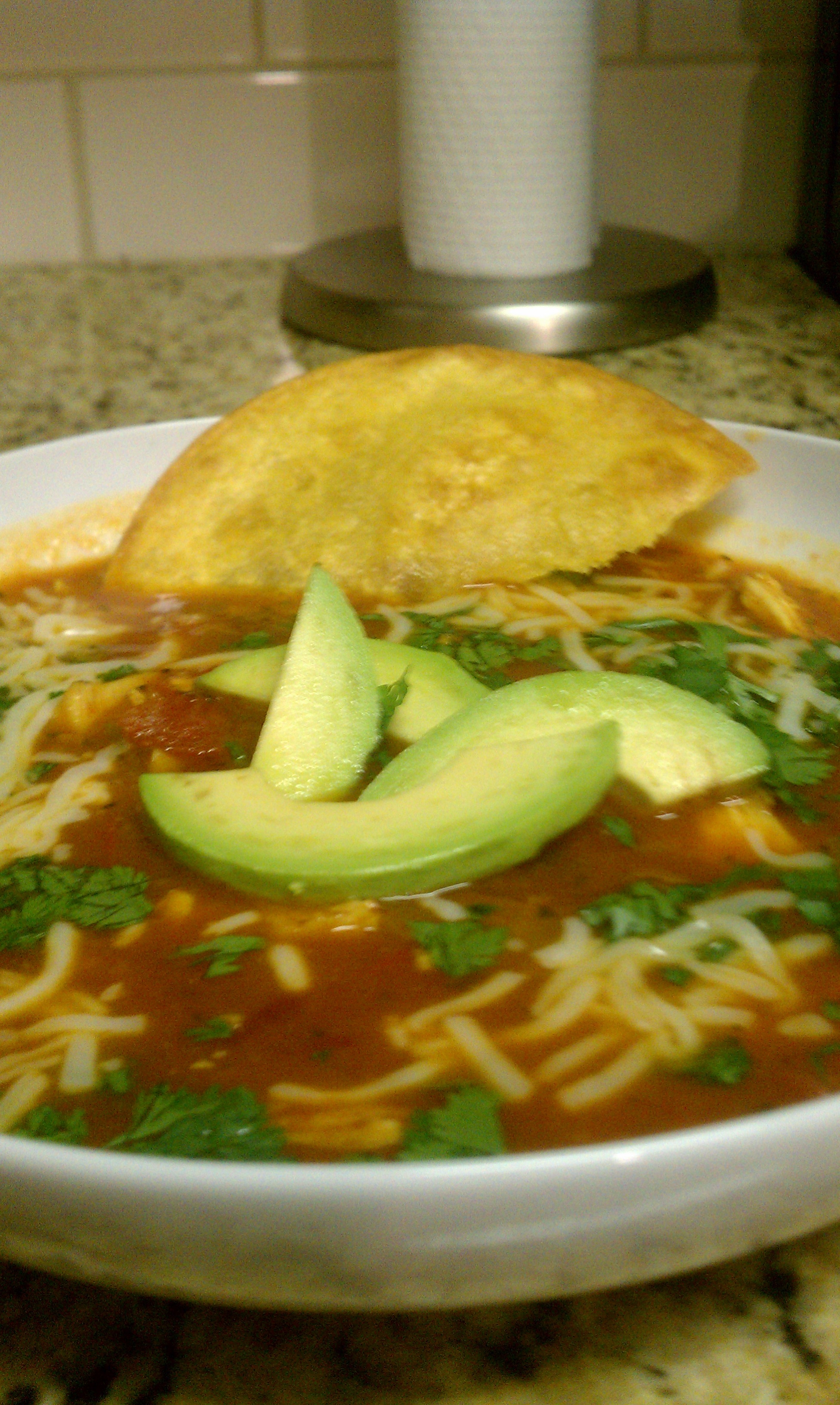 Meanwhile, shred (or pull) the chicken from the bones and reserve in a large bowl. If serving as stew, return chicken to pan and garnish with the listed items. Serve with warm corn tortillas. The picture below is of the tacos we ended up making (pursuant to the story before). I chopped tomatoes and avocado, then made tacos with the stew and the garnish. They were fantastic.