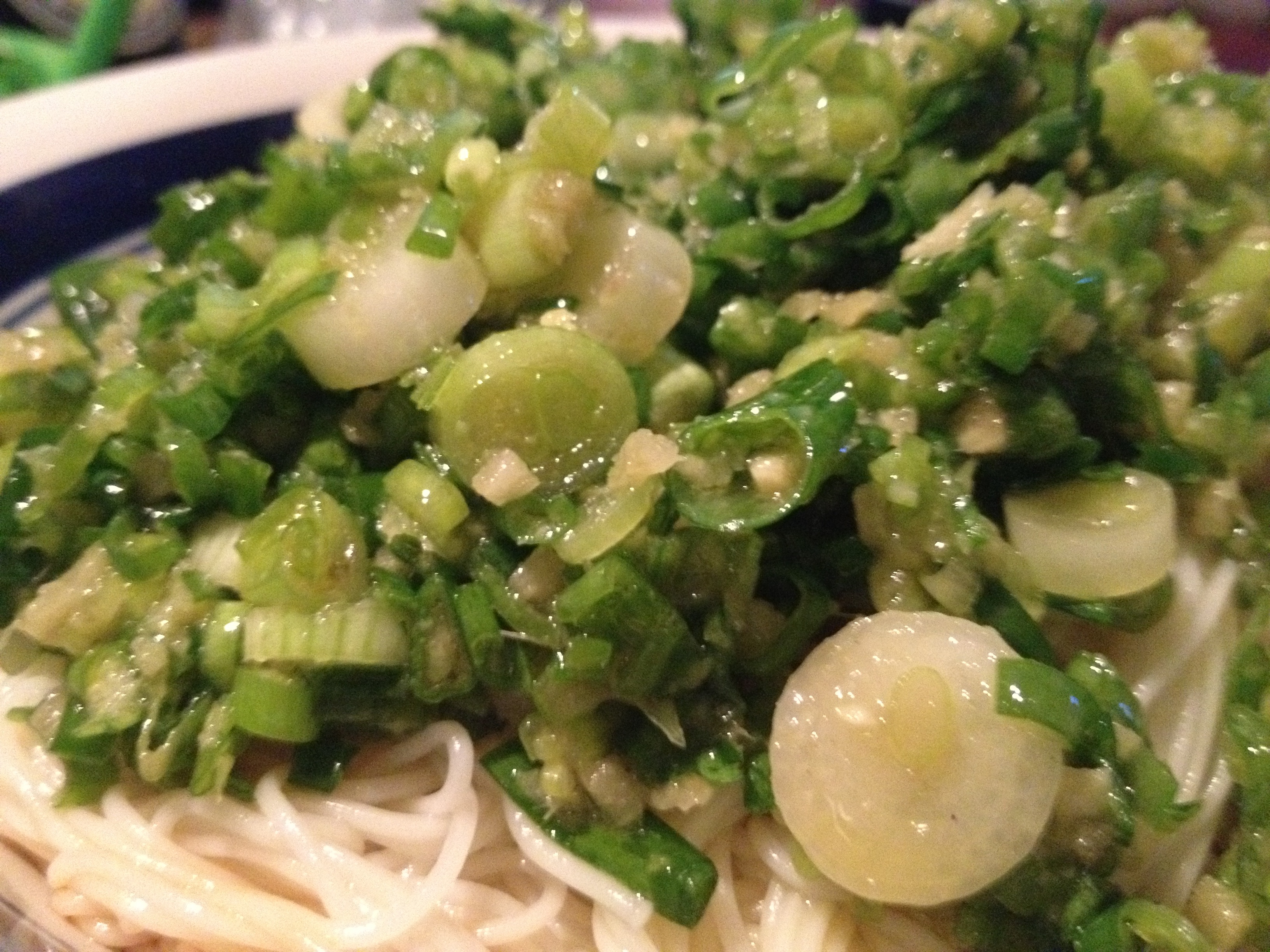 The main reason I was excited about Asian, apart from it’s generally being awesome sauce, was because I got to re-browse through Momofuku. It is a Greek tragedy, but Momofuku has been accumulating dust since I have run out of cookbook browse time (well free time is one issue, the reading of the Hunger Games, 50 Shades, and Millennium Trilogies really sucked up most of my cookbook browse time). Travesty, I know. The book inspired me to make the somen as a separate dish from either the stir fry or protein. Somen with Ginger Scallion Sauce. The result, though adapted to utilize available ingredients, was delicious and easy peasy. As the book states, the sauce can top anything from noodles to meats and can be used for a few days. If serving with noodles, remember to serve with side accoutrement of sriracha, somen dipping sauce or soy, and hoison as the sauce is not liquid heavy – and because those ingredients are just plan tasty.