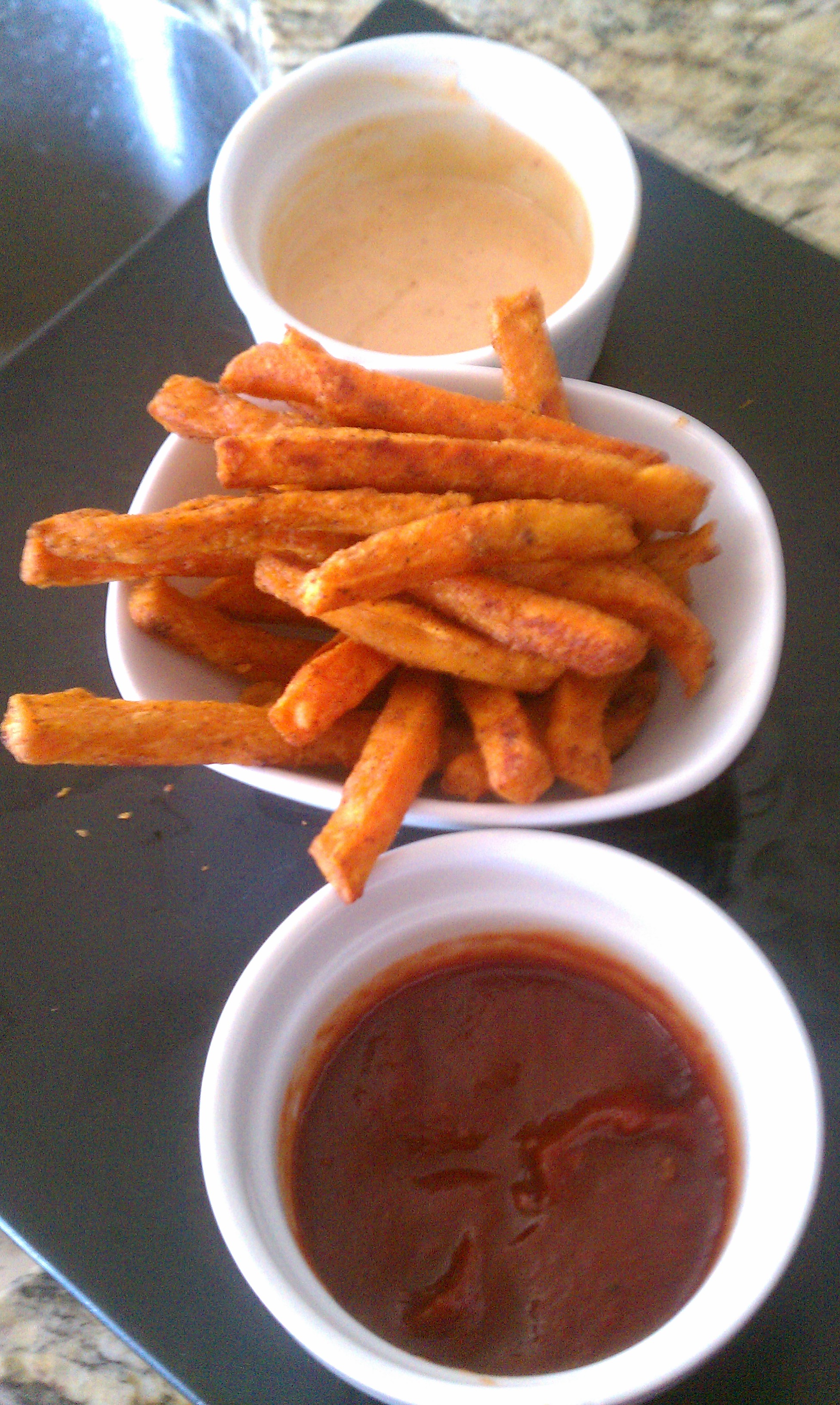 Chipotle Sweet Potato Fries with Curry Ketchup and Sriracha Aioli